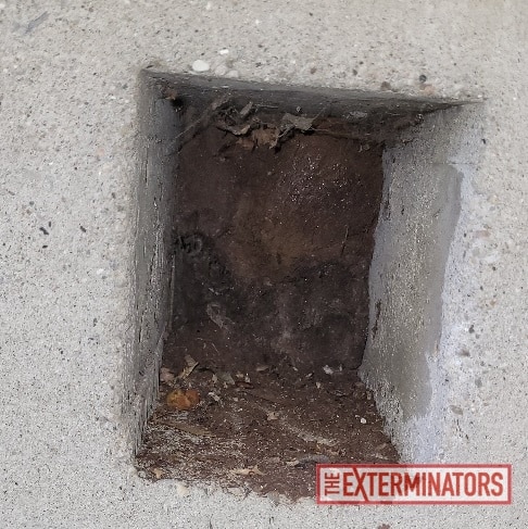 Photos taken during service show: Gaps and deteriorated material along lower wall sections near grade level. An exterior wall vent with surrounding openings at the foundation interface. Foundation edges and utility-adjacent areas where small voids were visible
